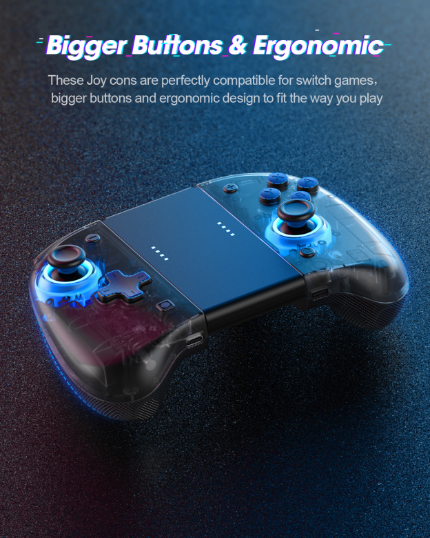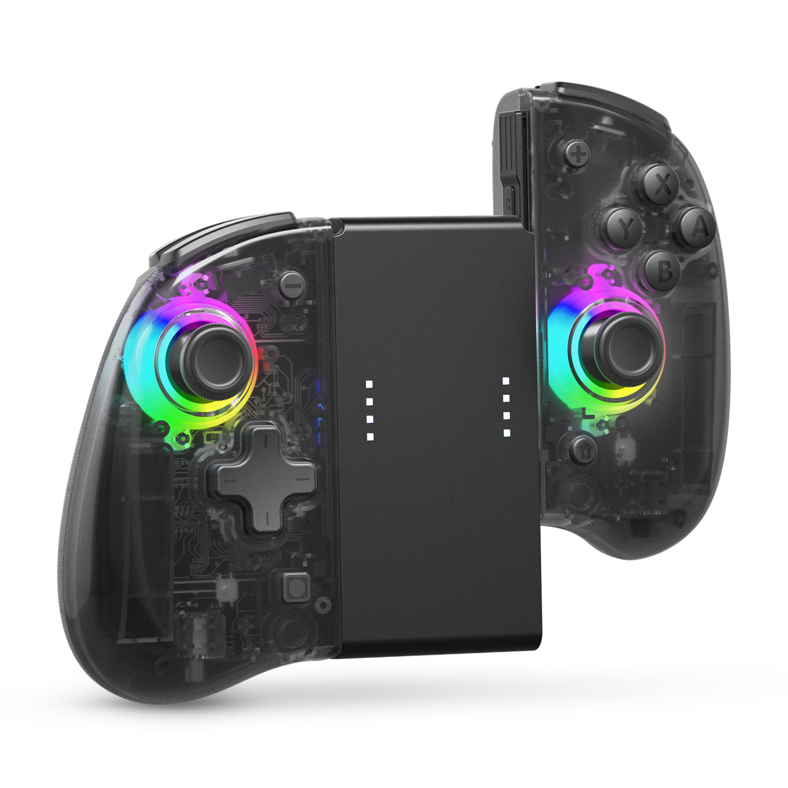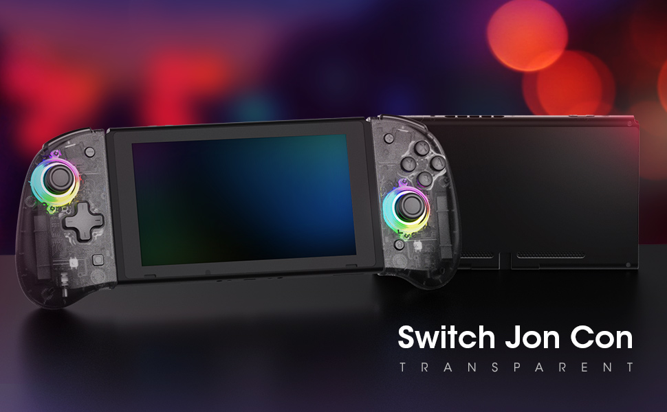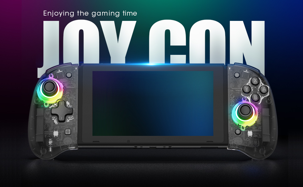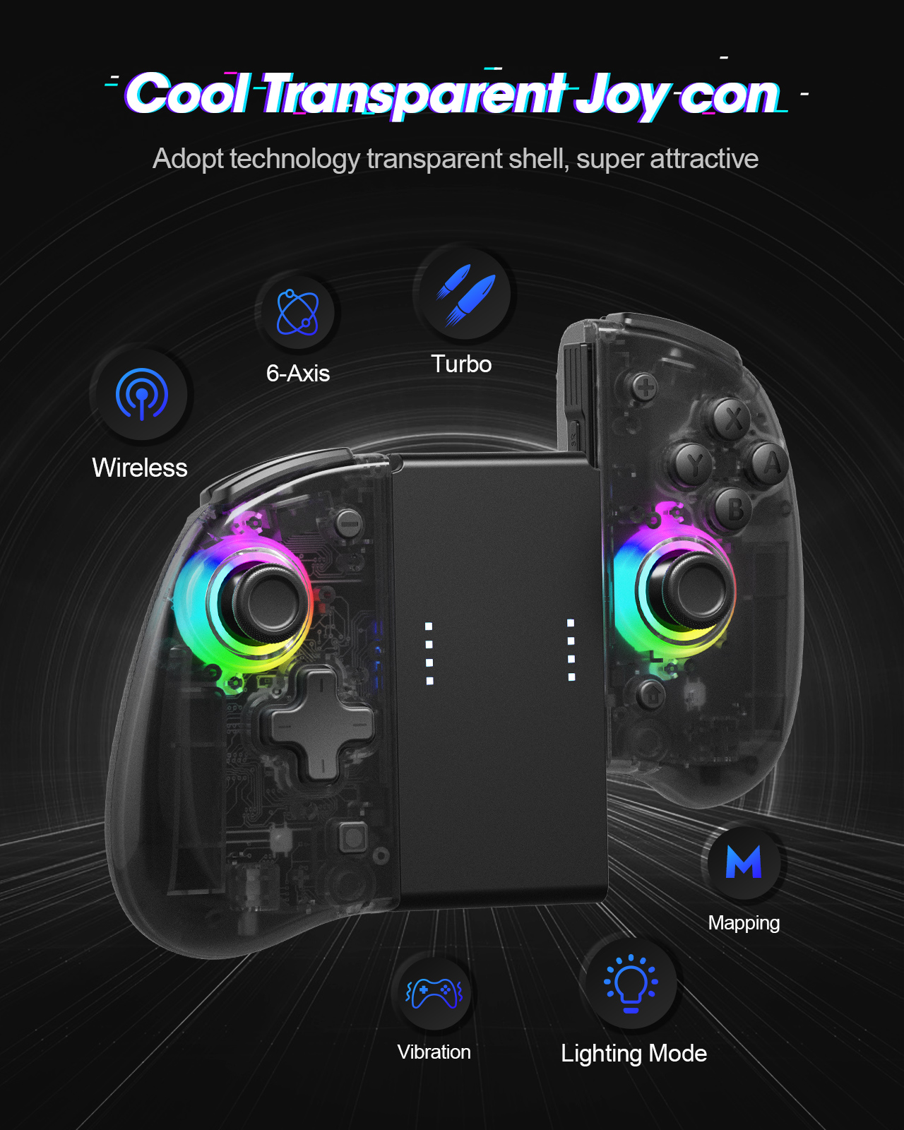 - [Cool Black Semi-transparent & Colorful RGB] All-inclusive transparent appearance on this switch Joycon, is extremely eye-catching. Seven-color light ring and three lighting modes of monochrome, breath, and rainbow for you to customize.
