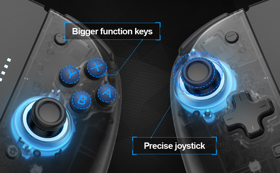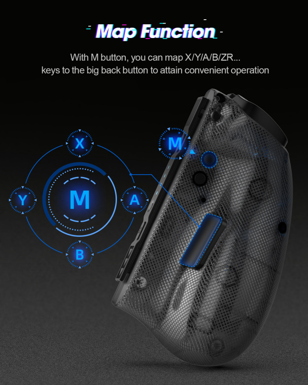- [Back M Button & 360°Precise Joystick] Adopt a high-quality joystick and bigger M button, the switch joycon controllers make activation accurate and sensitive. X/Y/A/B/... keys can be mapped to the M BUTTON, which is more convenient to operate and makes it easier for you to win the game.