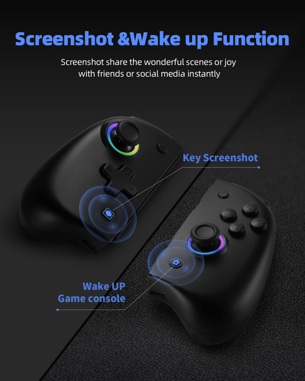 Press the screenshot key to record your fantastic game moments, then you can share them with your friend. You can press the HOME button for 1-2 seconds, and then the switch will wake up.