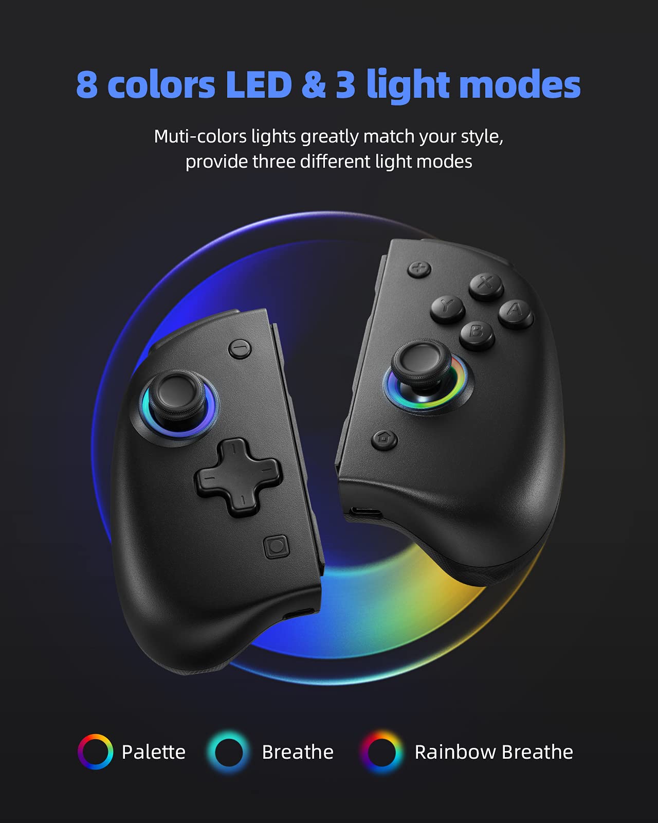 - [8 colors LED Ring Light & 3 Different Modes] Well-designed Adjustable LED ring light of 8 colors! This is the COOLEST joycon controller that has 7 colors & rainbow LED lights, plus 3 different light modes: Single Colour Mode, Breathing Color changing Mode, and Rainbow mode on the Left and Right Controllers.