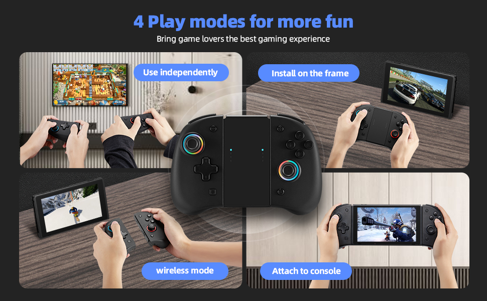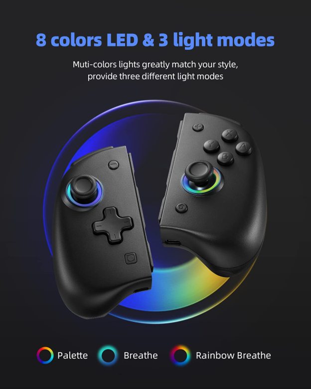 Well-designed Adjustable LED ring light of 8 different colors, greatly matches your style. The joycon controller has 7 colors & rainbow LED light, plus 3 different light modes.