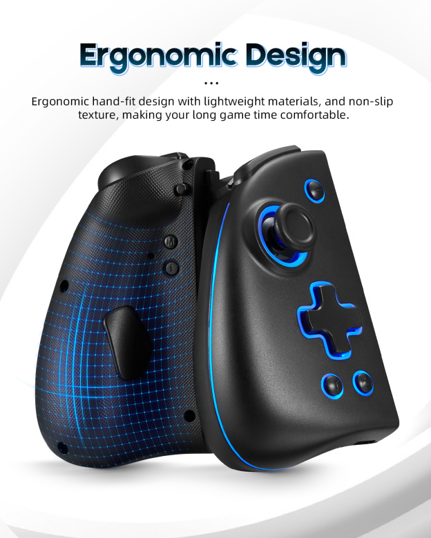 - [Ergonomic&Non-Slip Design] Ergonomic hand-fit design with Lightweight materials make the joycon controller game-time comfortable. Bigger buttons and joysticks avoid pressing other buttons by mistake. The back of joycon is designed with a special anti-skid pattern, which helps increases friction and reduces the unpleasant experience caused by hand sweat.