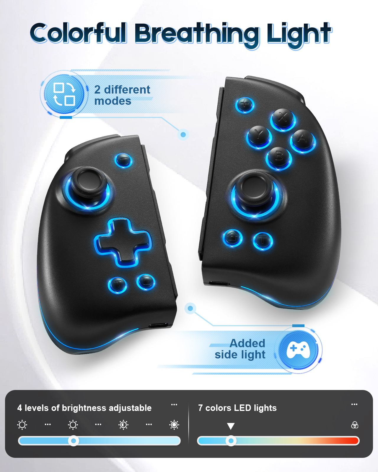 - [7 colors LED Lights & 2 Different Modes] Well-designed Adjustable LED ring light of 7 different colors! Added side light lamps, featuring cool 7-color LED lights, along with 2 different light modes: Single Color Mode and Breathing Color Changing Mode on the Left and Right Controllers.